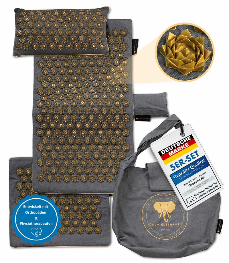 Platz 3 unserer Favoriten: Das Calm Elephant Akupressurmatte-Set fördert gezielt Entspannung und lindert Beschwerden. Mit ergonomischem Design, hochwertigen Materialien und einer beruhigenden 3-Jahres-Garantie.